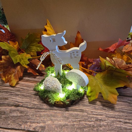 Deko Rehkitz auf Baumscheibe mit Pilz & Igel