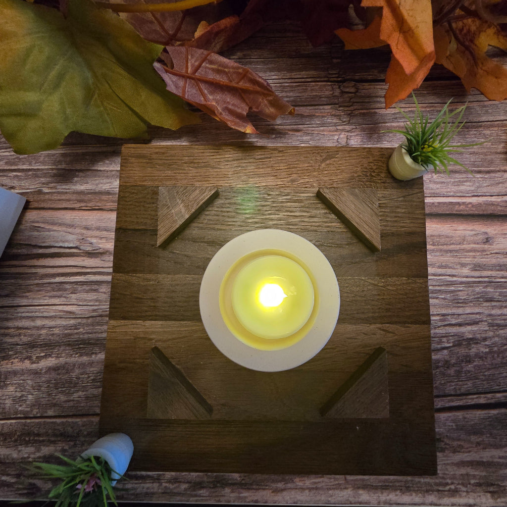 Dieses große Lichthaus verbindet schlichte Eleganz mit natürlicher Wärme. Der Boden ist aus massiver Räuchereiche gefertigt und trägt einen Einsatz für ein Teelicht. Das Dach besteht aus Eicheklötzchen, die dem Haus einen rustikalen Charakter verleihen.