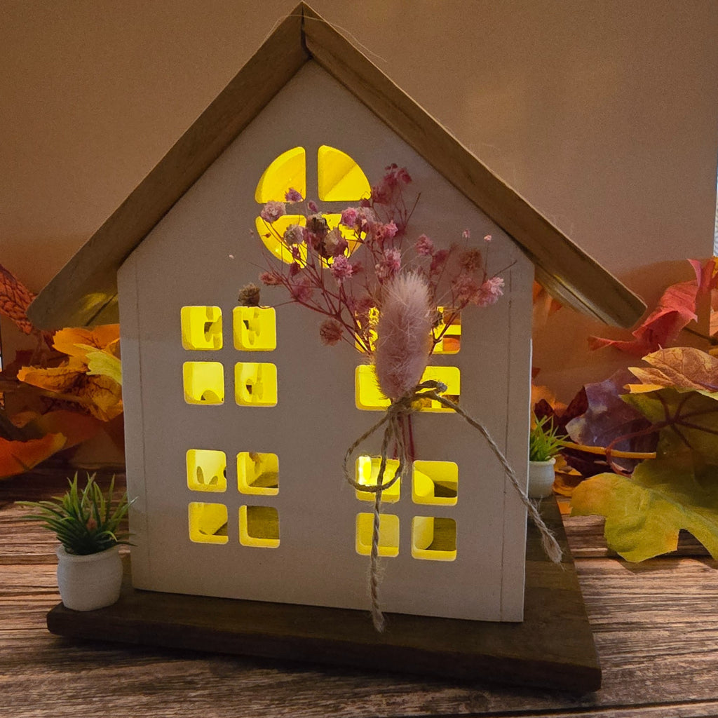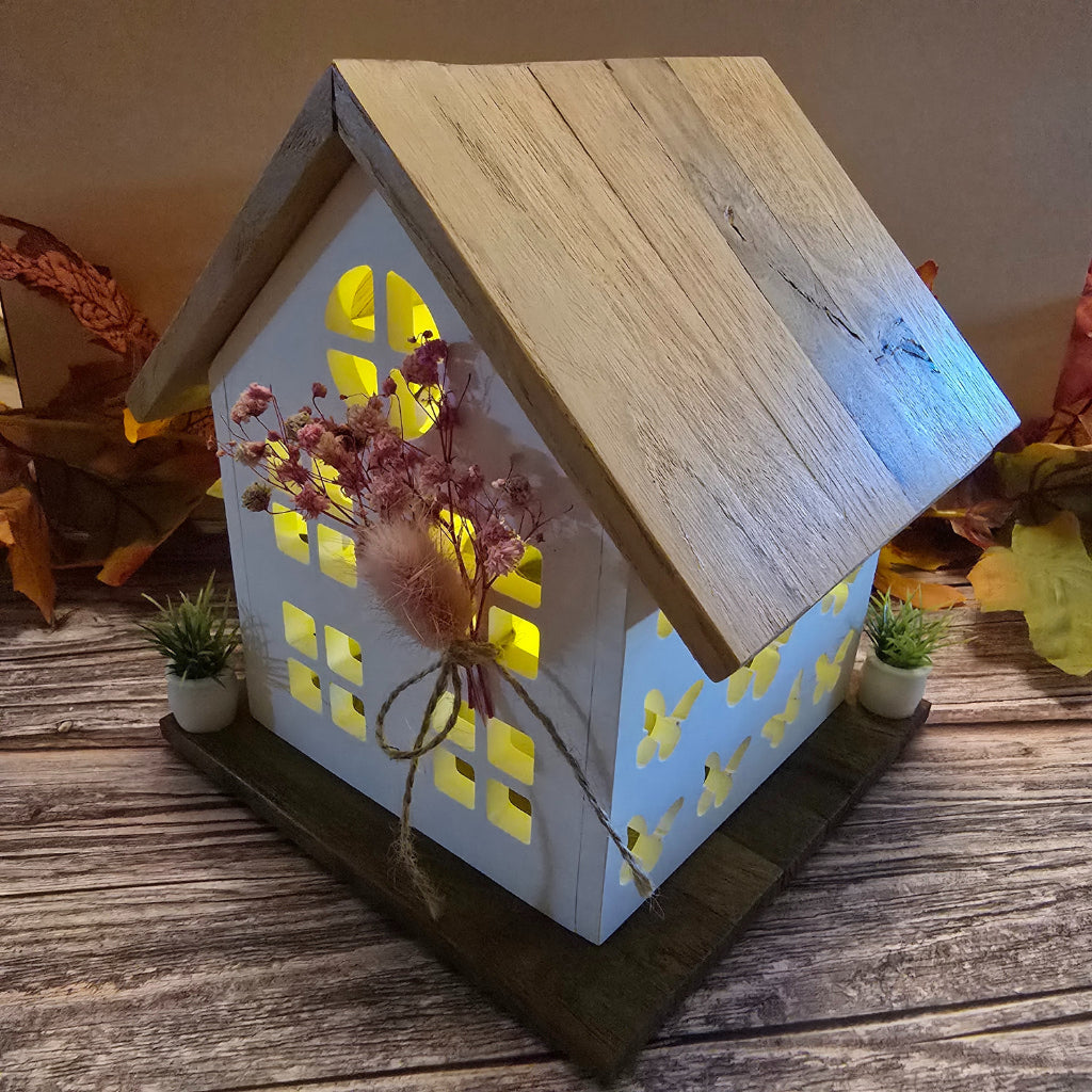 Zwei kleine Blumenkübel am Sockel runden das Arrangement ab und machen das Lichthaus zu einem besonderen Blickfang. Im Dunkeln zaubert es durch die Fensteröffnungen ein stimmungsvolles Lichtspiel, das jedem Raum Gemütlichkeit verleiht.