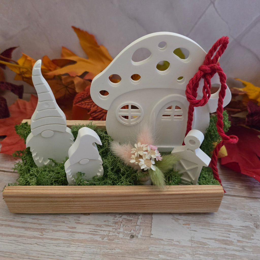Wenn die Tage kürzer werden, ziehen die Wichtel ein: In meiner handgefertigten Wichtelwelt treffen zwei kleine Wichtel auf ihr Pilzhaus, eine Laterne und eine Blumenvase. Umgeben von Moos und Trockenblumen entsteht eine liebevoll gestaltete Szene, die den Zauber von Herbst und Winter einfängt. Perfekt als stimmungsvolle Tischdekoration, auf der Fensterbank oder als kleines Geschenk für alle, die Wichtel genauso lieben wie ich.